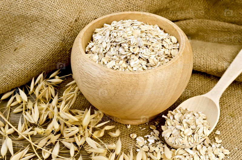 Овсяные хлопья в чаше с ложкой на мешковине