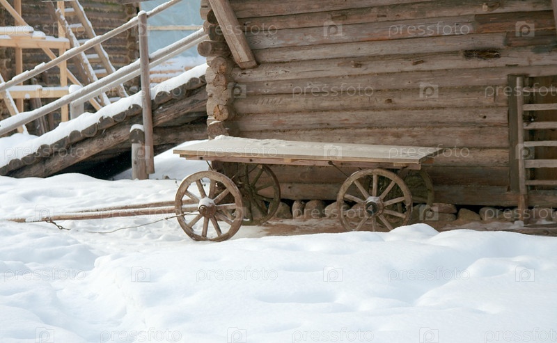 Деревянная тележка возле крестьянской хижины.Современная реконструкция русского крестьянского быта начала XX в