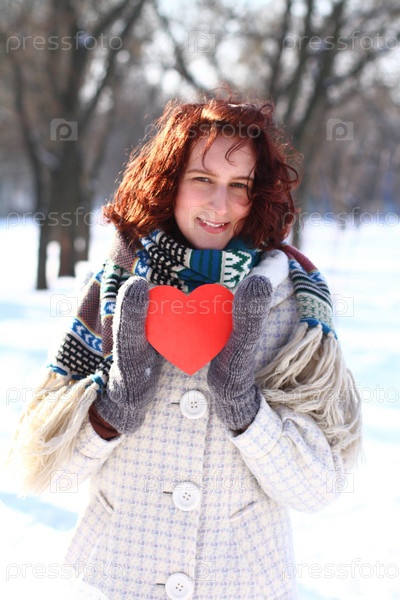 Зимняя улыбающаяся женщина держит красное сердце