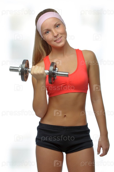 Блондинка со штангой в руках на белом фоне