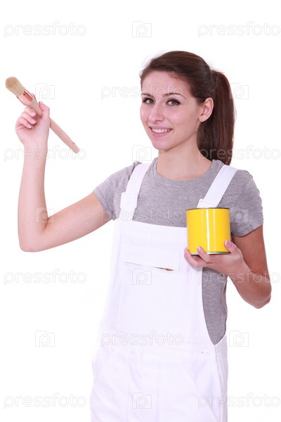 Женщина держит банку краски и кисть