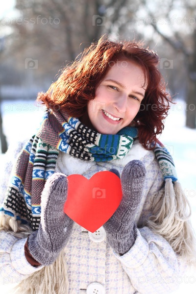 Милая зимняя романтическая девушка держит красное сердце на открытом воздухе