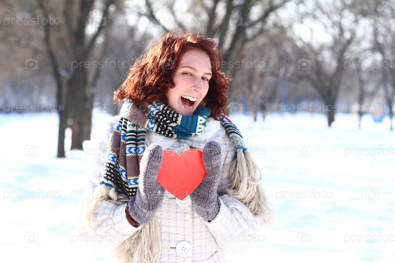 Милая зимняя романтическая девушка держит красное сердце на открытом воздухе