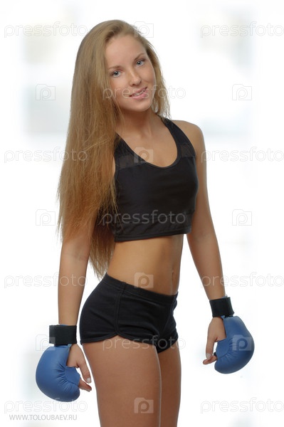 Молодая блондинка с боксерскими перчатками на белом фоне