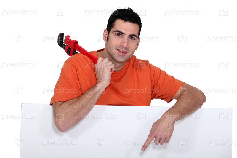 Рабочий держит гаечный ключ и указывает на белый плакат