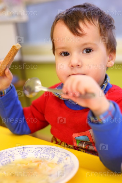 Маленький мальчик обедает в детском саду