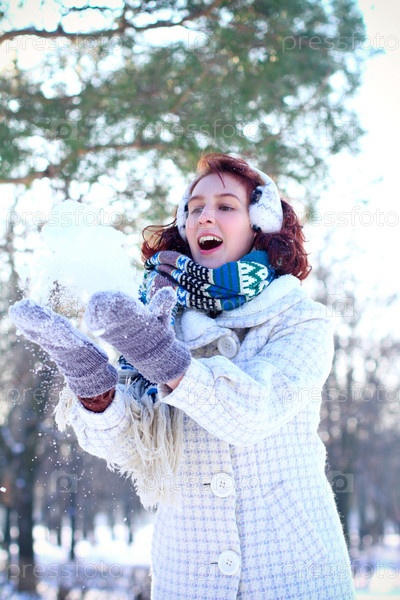 Зимний портрет счастливой девушки, бросающей снег в парке