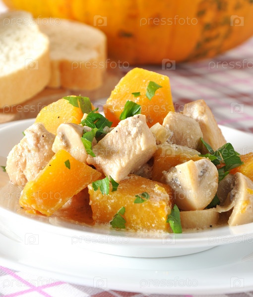 Тушеная курица с овощами и грибами в сливочном соусе