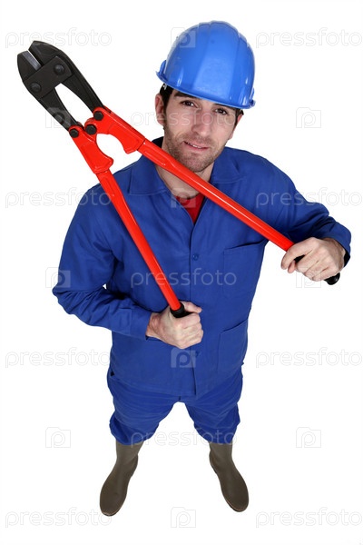 Строитель держит большие плоскогубцы