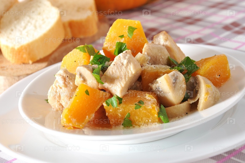 Тушеная курица с овощами и грибами в сливочном соусе