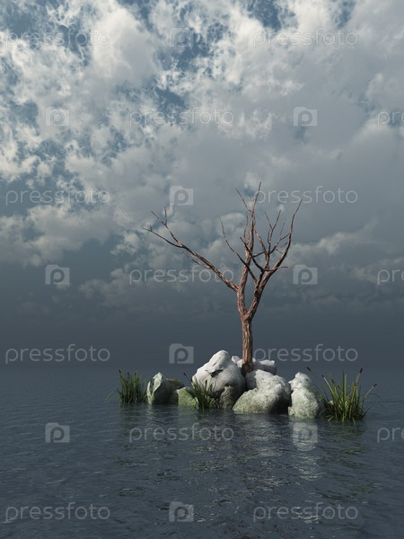 Мертвое дерево среди темных вод. 3D иллюстрация