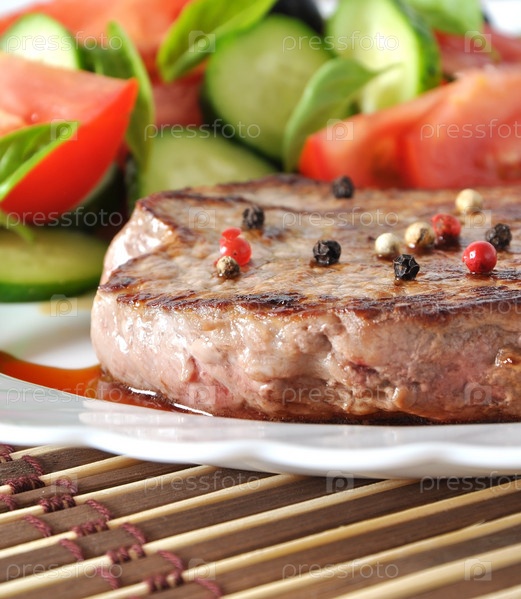 Бифштекс, приготовленный на гриле со свежими овощами крупным планом