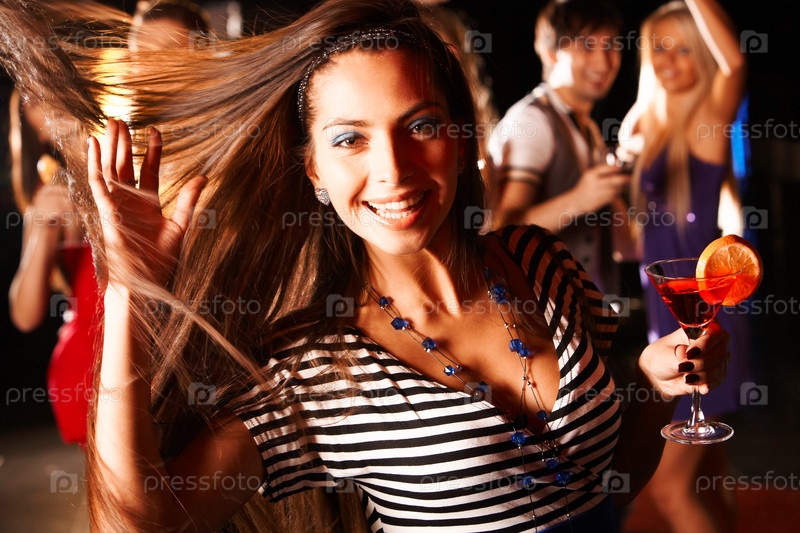 Портрет веселой девушки, танцующей на вечеринке со своими друзьями позади
