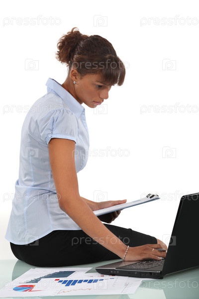 Женщина, сидящая на ее столе, с планшетом и ноутбуком