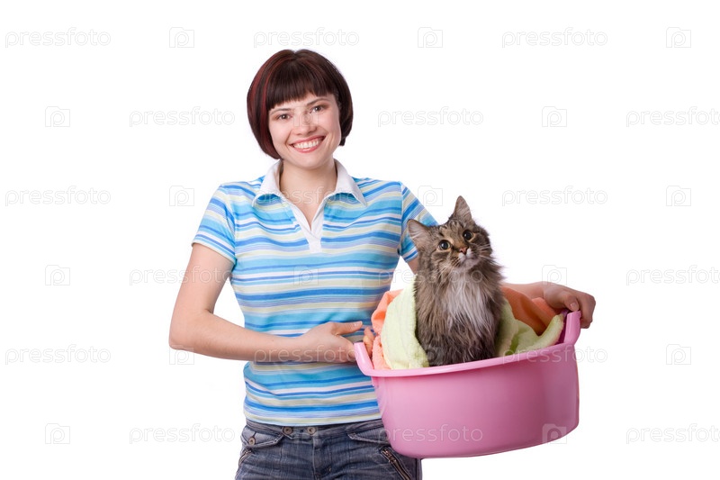 Домохозяйка с корзиной для белья на белом фоне