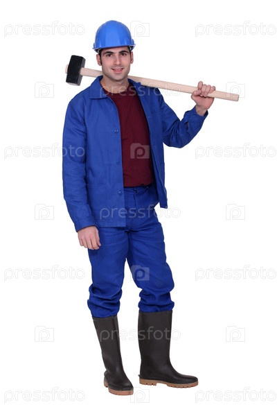 Мужчина стоит, положив кувалду на плечо