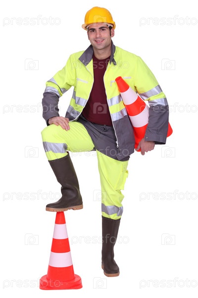 Рабочий с ногой на дорожном конусе