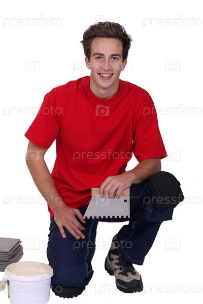 Молодой человек укладывает плитку