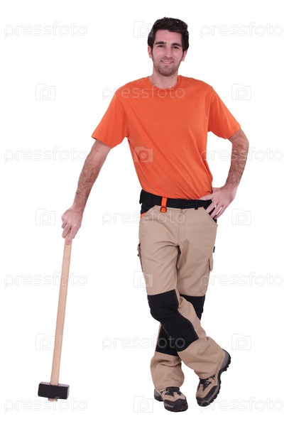 Рабочий в брюках с заплатами опирается на молот