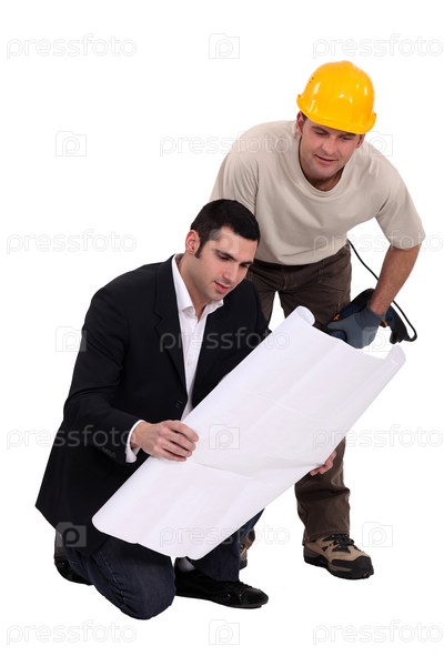Строител консультируется у инженера над чертежом