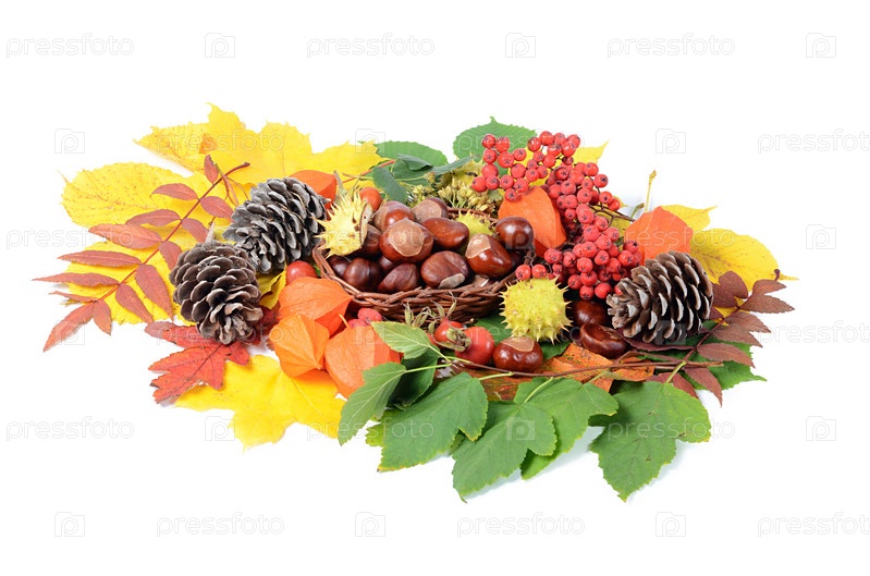 Каштаны на осенних листьях, изолированные на белом фоне