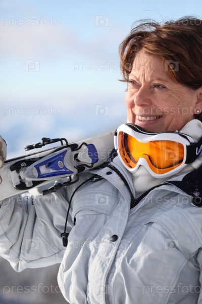 Женщина среднего возраста катается на лыжах в горах