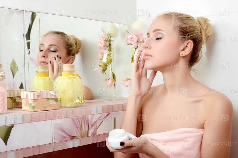 Красивая блондинка накладывает крем на лицо