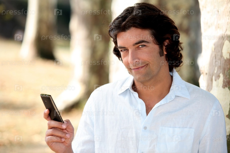 Мужчина отправляет текстовое сообщение в лесу