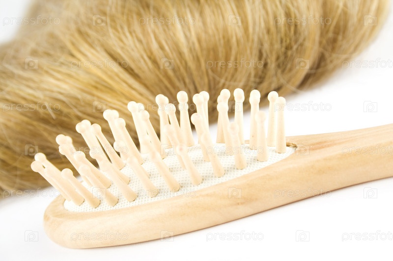 Расческа и светлые волосы на белом фоне
