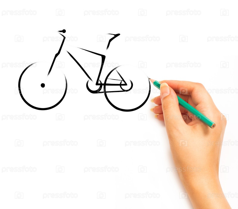 Женская рука рисует велосипед на белом