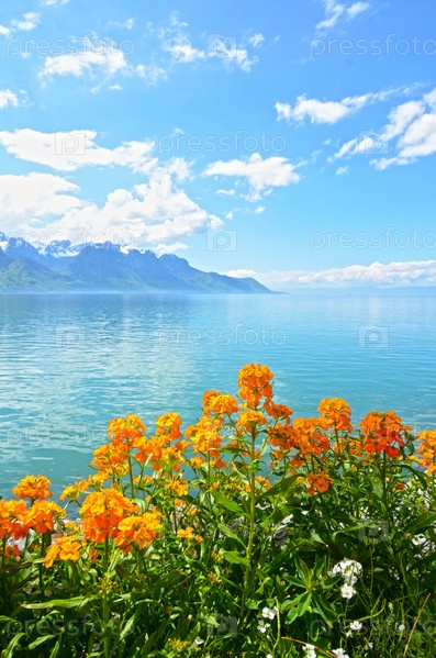 Цветы на фоне гор и Женевское озеро с набережной в городе Монтре. Швейцария