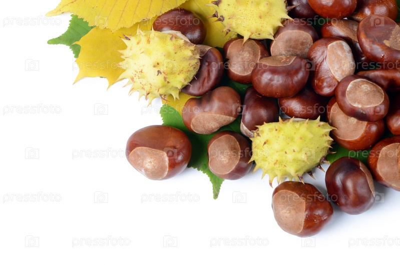 Каштаны на осенних листьях, изолированные на белом фоне