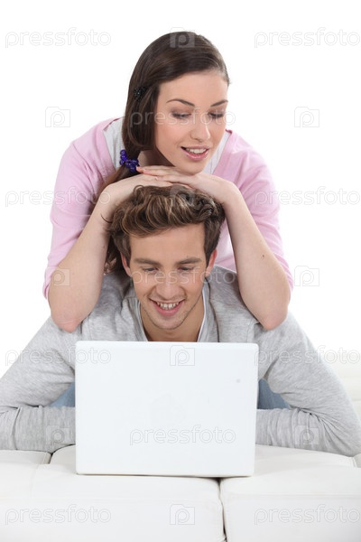 Ласковая пара использует ноутбук вместе