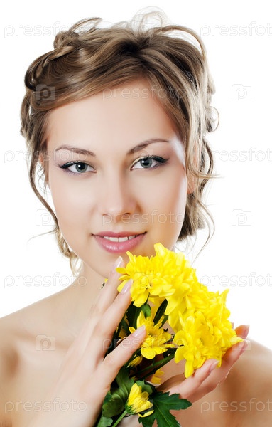 Девушка с красивыми волосами с желтой хризантемой