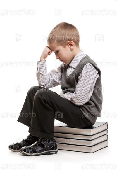 Ребенок сидит на книгах в позе мыслителя