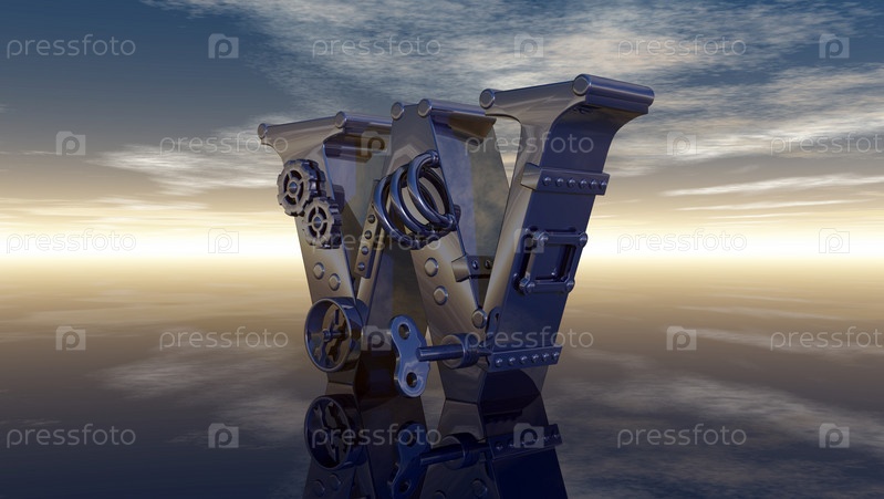 Механическая буква w под облачным небом. 3d Иллюстрация