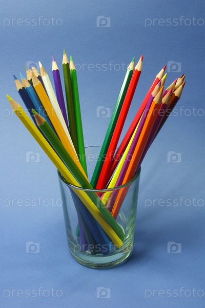 Цветные карандаши в стакане на синем фоне