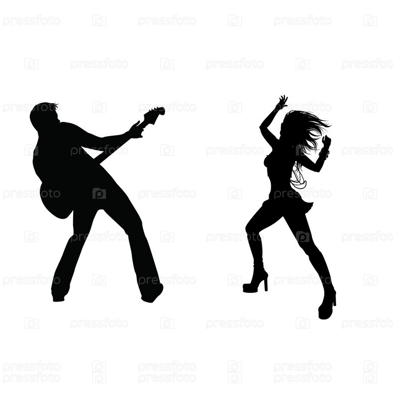 Силуэты мужчины с гитарой и танцующей женщины, на белом фоне