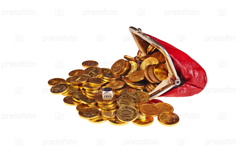 Разбросаны золотые монеты, красный кошелек и кость со словом "продать", изолированные на белом фоне