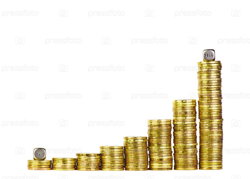 Растущая диаграмма из золотых монет и кости со словами "продажа" и "покупка"