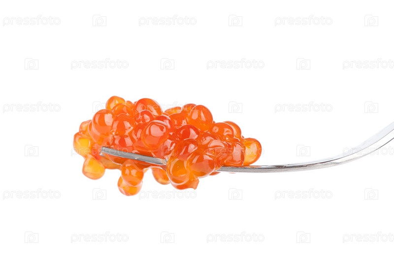 Красная икра на вилке, изолированная на белом
