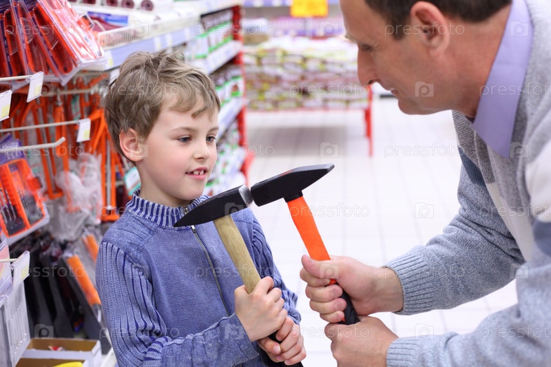 Пожилой мужчина с мальчиком в магазине с молотками в руках