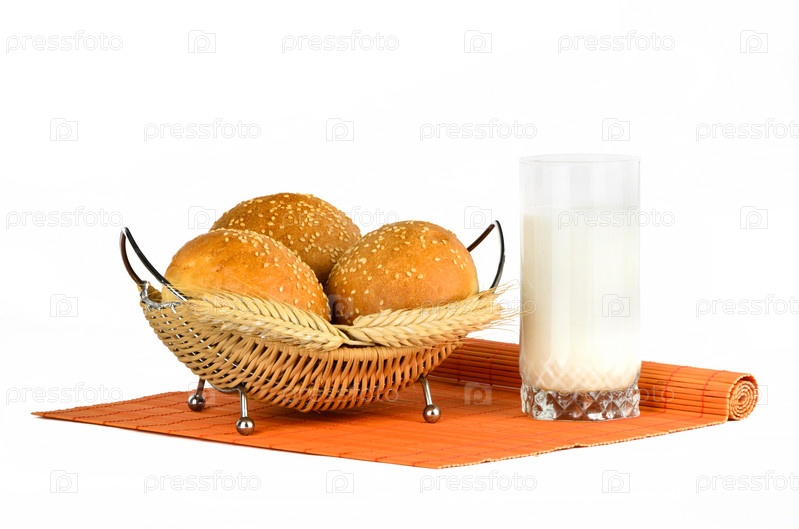 Булочка с кунжутом в корзине и стакан молока на белом фоне