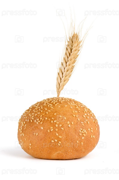 Булочка с кунжутом и колоском на белом фоне
