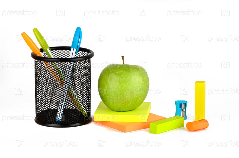 Канцелярский набор с зеленым яблоком на белом фоне