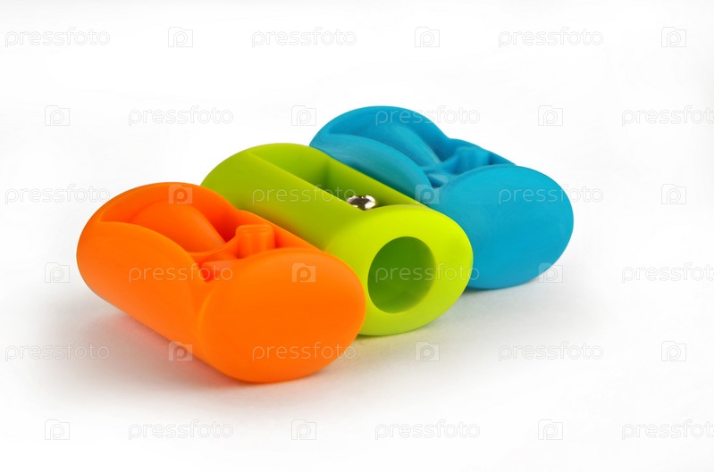 Три разноцветные точилки на белом фоне