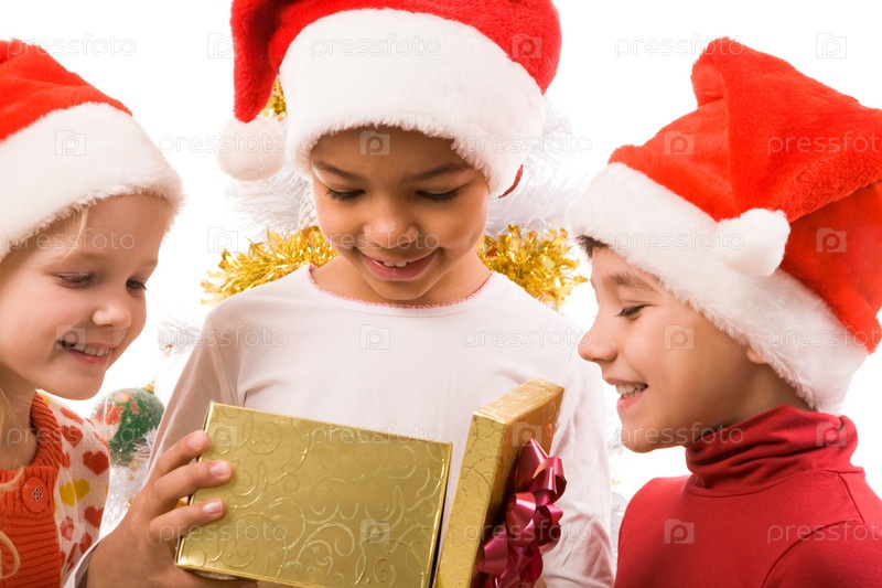 Смуглая радостная девочка с подарком в окружении друзей