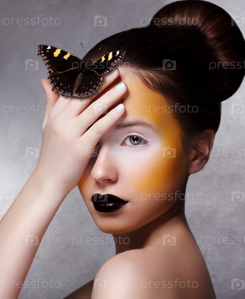 Модная женщина с бабочкой. Яркий творческий макияж. Черные губы
