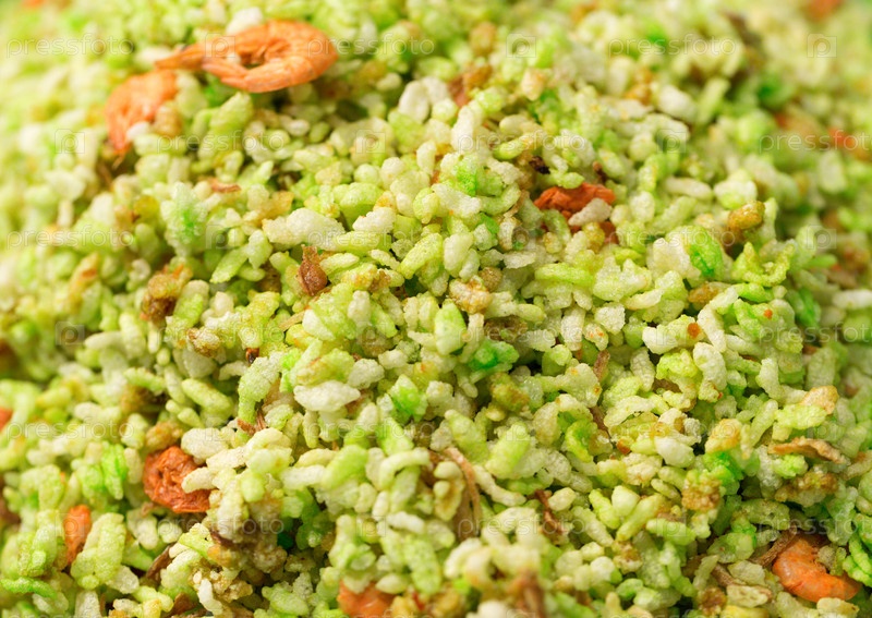Зеленый рис с креветками крупным планом