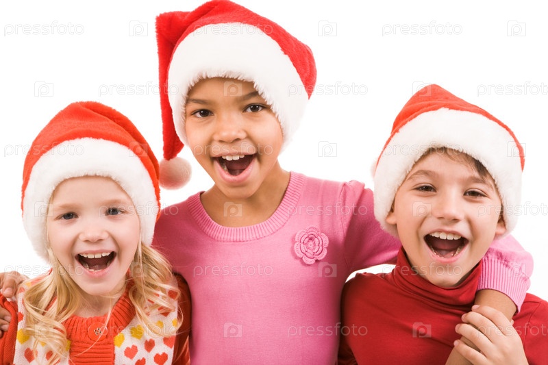 Веселые друзья в новогодних колпаках